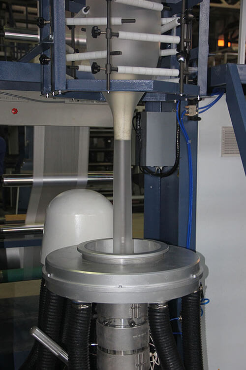 錐形疊加模具:?jiǎn)螌庸矓D吹膜機(jī)生產(chǎn)線采用的是單層錐形模具。我們通過(guò)熱流體學(xué)優(yōu)化布局,并借助3D模擬仿真軟件觀察流體情況。我們確信經(jīng)過(guò)高度的拋光和鍍膜工藝后,經(jīng)奧翔高速螺桿的高壓,高速?zèng)_刷,每個(gè)流道都具有自清潔能力。從而減少粒子更換過(guò)程中的浪費(fèi),減少停機(jī)維護(hù)時(shí)間。